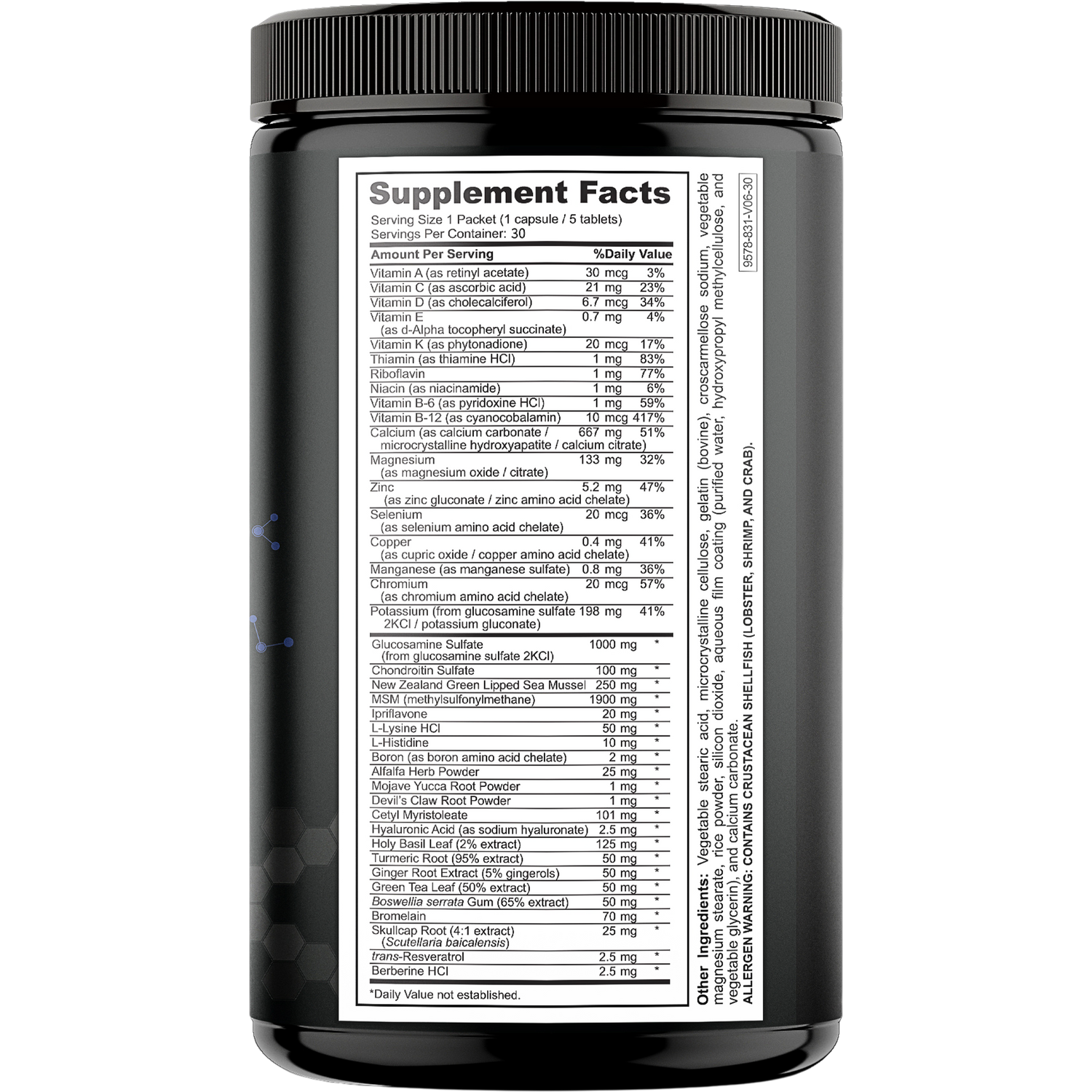 Cetyl Myristoleate 100 mg, Hyaluronic Acid 2.5 mg, MSM 100 mg, Holy Basil 125 mg, Turmeric 50 mg, Ginger Root 50 mg, Green Tea Leaf 50 mg, Boswellia serrata 50 mg, Bromelain 50 mg, Skullcap 25 mg, trans-Resveratrol 2.5 mg, Berberine HCl 2.5 mg.