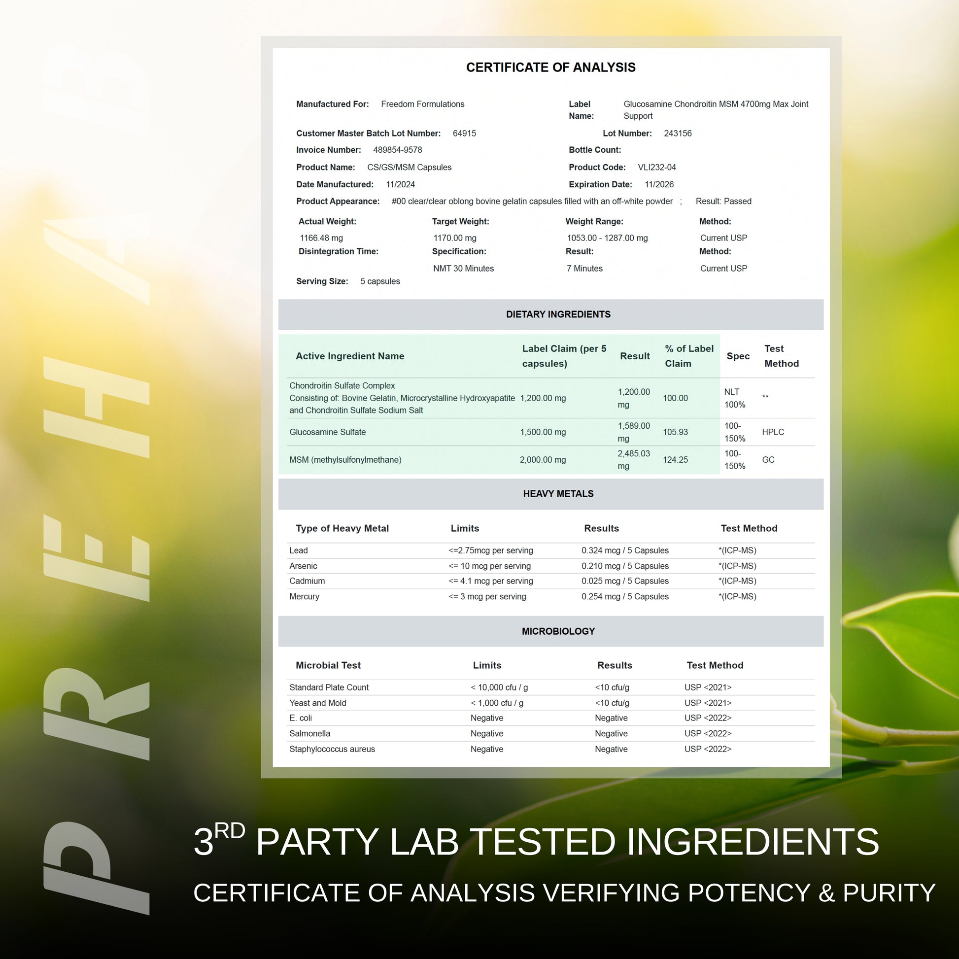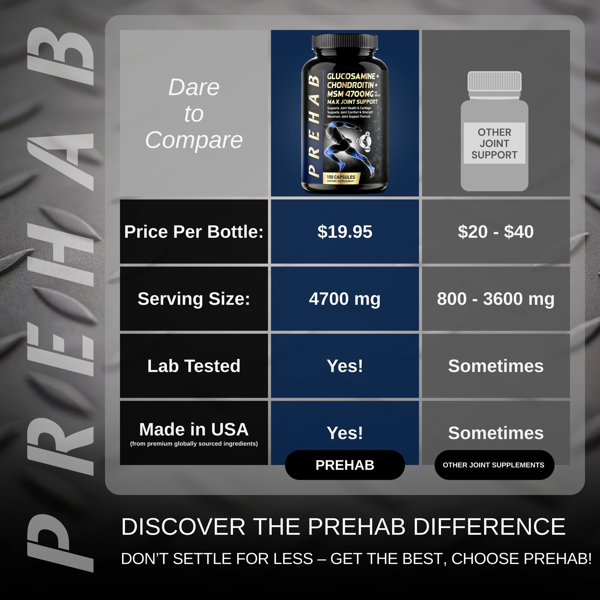 4. DISCOVER THE PREHAB DIFFERENCE. Don’t settle for less - get the best, choose PREHAB! PREHAB’s Max Joint Support supplement is crafted with top-tier, science-backed ingredients in a GMP-certified facility, guaranteeing purity and potency you can trust. Research confirms the power of Glucosamine, Chondroitin, and MSM for supporting joint health, and PREHAB’s unmatched formula brings it to life like no other.